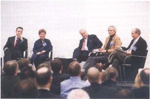 生態都市主義圓桌會議的交叉學科觀點。參加人員從左至右:格萊澤,哈佛大學經濟學弗雷德和埃莉諾Glimp教授,國家和本地政府的塔伯曼中心波士頓拉帕波爾特研究院的院長;麗莎白科恩,美國研究的霍華德芒福德瓊斯教授,哈佛大學歷史系主席;理查德T.T.福爾曼,哈佛設計學研究院景觀生態學高級環境研究PAES教授;勞倫斯·布爾,哈佛大學美國文學鮑威爾M. 卡伯特教授,和主持人阿歷克斯·克里格,哈佛大學設計學研究院城市設計實踐教授。