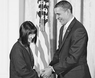 她是一名華裔女性,她的作品遍布美國各地,她的最新榮譽(yù)是獲得2009年度美國國家藝術(shù)獎?wù)拢⒃诎讓m接受了美國總統(tǒng)奧巴馬的親自授勛。該獎?wù)率潜碚盟鳛?a href="http://project.m.school2008.cn" target="_blank" title="園林工程">建筑師、藝術(shù)家環(huán)保人士的卓著成就,這是美國官方給予藝術(shù)家的最高榮譽(yù)。她——就是林瓔。