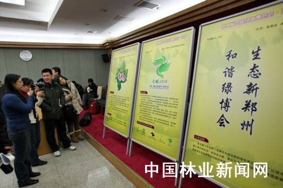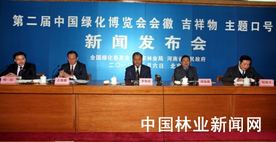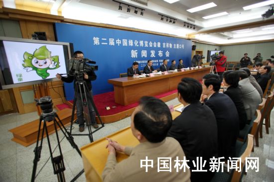 新聞發(fā)布會上揭曉的第二屆中國綠化博覽會會徽、吉祥物和主題口號。 |