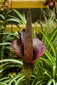 近日,上海植物園展覽溫室內引進了兩株十分珍奇的熱帶植物——魔芋(Amorphophallus konjac),其高度在40多厘米左右,幾乎沒有臭味,為市民提供了難得的一飽眼福的機會。