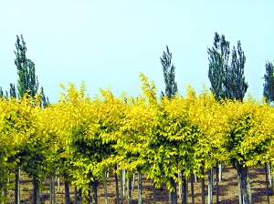 金葉榆 首批推廣的50多個耐旱品種大部分來自寧夏等西北地區。由于西北地區常年氣候干旱,土生土長在這里的花草灌木也天生練就了一身“不怕渴”的硬本領。以紫花醉魚木為例,這種原生于賀蘭山東麓的紫紅色灌木在年降雨量150至300毫米的環境下就可以生長,年耗水量僅是丁香、連翹等喜水植物的30%,冷季型草坪的十分之一,“在北京,幾乎不用灌溉,光靠正常的降雨,就能滿足它的生長需求。”項目負責人介紹。 不僅好活,好管,而且還耐看。據介紹,此次引進的50多個新品種分為觀葉、觀花、觀果、觀枝、常綠喬木和地被植物六大系列,各有各的觀賞性。觀葉植物如金葉蕕,從展葉初期到落葉終期,葉片始終呈現出燦爛的金黃色,8月到10月還會開出青紫色的花朵;觀枝植物如沙梾,夏秋兩季枝繁葉茂,到了冬季葉子全部脫落,枝條樹干呈現出鮮艷的紅紫色,遠遠望去,如紅云朵朵。還有像地被植物四季青景天,一年四季都能保持碧綠蔥蘢,綠化效果甚至不亞于草坪。 從2004年起,這些耐旱植物品種已經在長安街延長線沿線、奧運綠化工程、區縣公園小規模試種。經過幾年的耐受性實驗后,今年,市園林綠化部門將在本市,特別是在郊野公園大面積推廣種植。