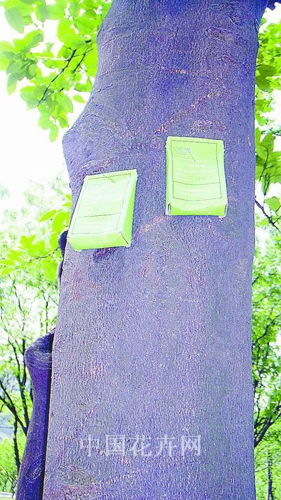 圖為園區樹上釋放天敵的小盒子。