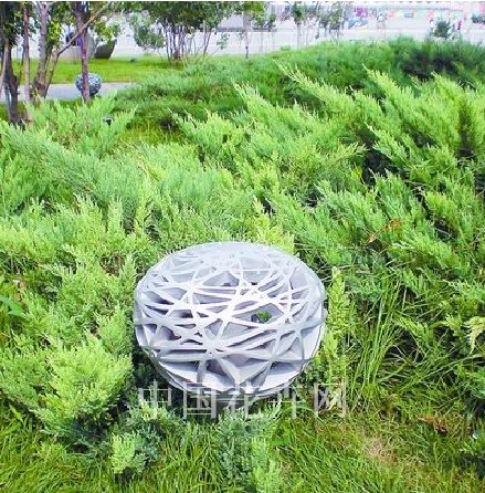 綠地中鳥巢造型的園燈與旁邊的國家體育場相呼應