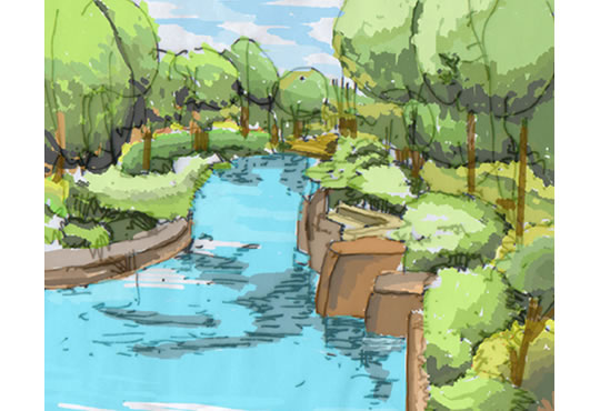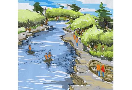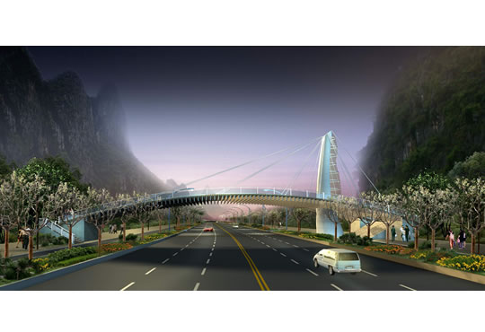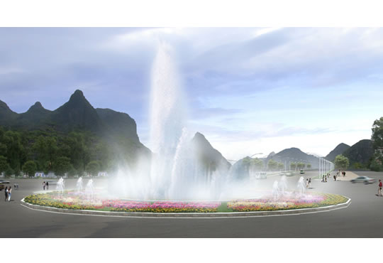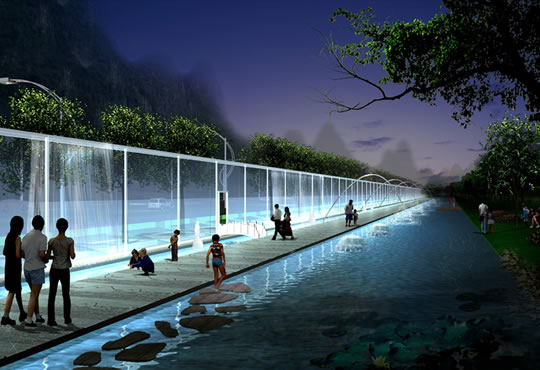 將人群分為:車行和人行,本地居民和外地觀光者,早、中、晚不同使用人群,針對不同的環境限制,環境體驗,結合21世紀生態學成果,將機場路分為三大段:生態水景大道、生態山景大道、生態城景大道,塑造一個西桂林生態風光帶。
