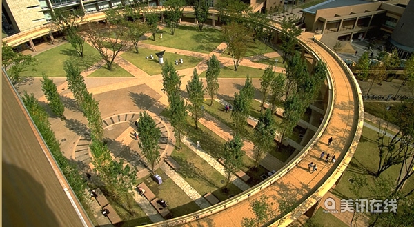 為了將校園與周圍環境聯系起來,設計師們為商業中心區和位于學校西南部的公交中轉站到東北部的第二個中轉站之間搭建了一道明顯的軸線。這條作為軸線的人行道將繁華的都市中心區生活帶到了與其聯系而又獨特的校園中來。另外,這種獨特的造型和景觀空間設計弱化了學校的超高層建筑在市郊地區的突兀性,使學校變為一個學習與交換想法的休息場所。