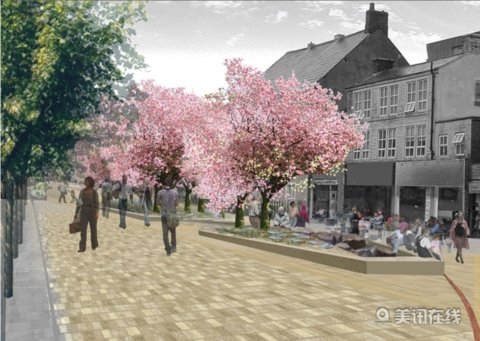 Landscape Projects公司的獲勝作品是把阿克寧頓市表達成一個花卉市場的小鎮,并建議在臨近的市場和市政大廳建造一個露天場所。設計小組的想法中包括植樹,提供座椅以及一個引人注目的鐵制弧形建筑,用來述說城市的故事。