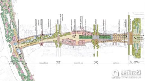 步行街的景觀設計中融入了現代元素和法國古典風格。高大的銀杏樹沿著商店前的街道排成一排,讓住宅大廈自然地過渡到街道花園;四季常青的樟樹和城市的硬邊環境形成鮮明的對比,這些樹組成了一個全年的迎客“天篷”;而每年落的櫻樹能讓你欣賞四季不同的景色。為了能刺激人們的各種感覺,景觀設計師在設計中也采用了一些芬香植物,如桂花樹,細小的黃色花朵能散發出成熟桃子和杏子的香味。