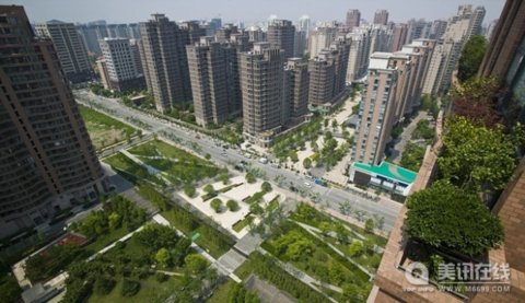 距離大廈一樓商店不遠處是步行街的中央廣場,上面大量的長凳和濃密的樹蔭為住戶提供了一個社區交流場所。家長們坐在長凳上,看這他們的孩子滑旱冰,而老人們則在小的花園區內打太極。
