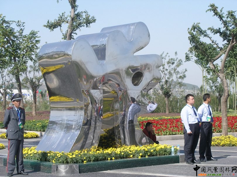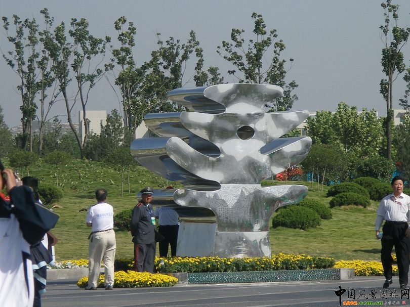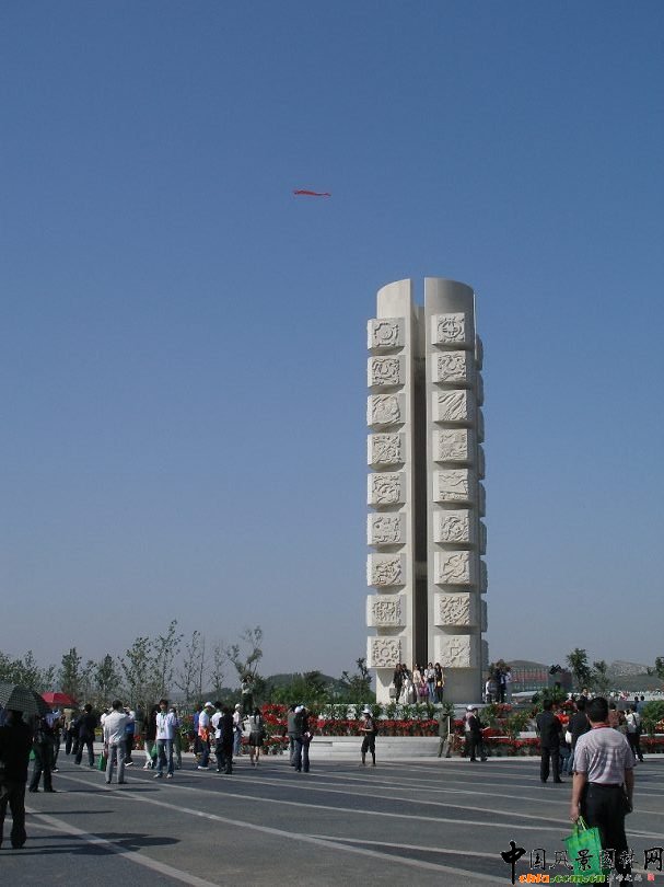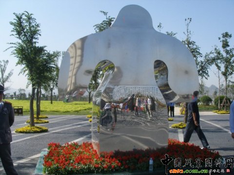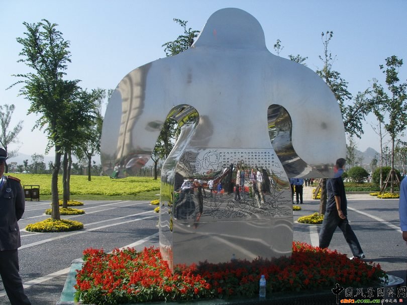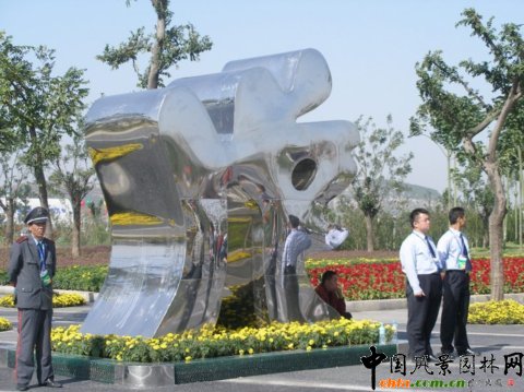 廣場中心矗立著高20米的園博園主體雕塑,其外形借鑒中國古代玉琮的形狀。玉琮是古人祭祀天地的重要禮器,是最早與天溝通的器物與象征,禮祀上天并祈望溝通的活動從古至今人類從未停止,并直接影響和促進了現代人類對外太空的科學探索。雕塑呈高聳的柱狀,柱身利用玉琮造型自然的紋理層(共九層,九為陽數,代表天),從下至上用浮雕的形式分別展示了原始天體圖、古代彗星圖、星座圖、渾天儀、天文望遠鏡、衛星、太空艙、航天飛船、太陽系等圖案,反映了人類對天體的認識不斷提升,探索天體科學的追求永不停息。雕塑的柱身是空心的,內部通過燈光處理,夜間顯得更加雄偉、神秘。