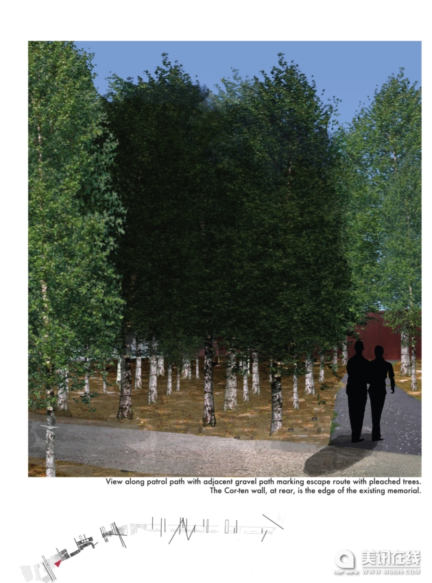 現(xiàn)存紀(jì)念樹(shù)林鳥(niǎo)瞰圖。中斷現(xiàn)存的巡邏通道和樺樹(shù)林的碎石路是逃亡路線(xiàn)的標(biāo)志。現(xiàn)存的歷史殘留物有路燈,以此點(diǎn)綴了景觀
