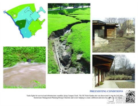 烏龜為生存而做出努力,基礎(chǔ)設(shè)施破壞了校園小溪。ISC雨花園所在地是在2006年秋季雨水管理規(guī)劃/設(shè)計(jì)研討會(huì)上發(fā)現(xiàn)的,現(xiàn)在這個(gè)地方正在創(chuàng)造一種不同的更有意義的校園。