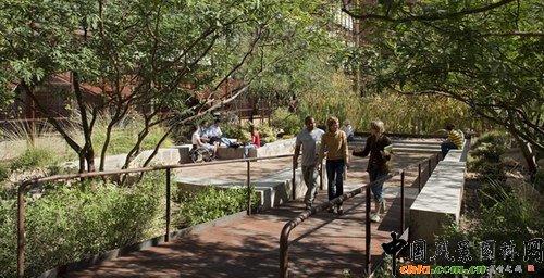 倘若儲罐已滿,又遇上下雨天,該系統還設計了將溢出的水運輸到荒野河岸池塘里,然后進入生態濕地的旱谷中。設計旱谷是為了吸收水分,在進入校園雨水系統較低的排水口之前,讓它更慢流過種植著亞利桑那州當地植被的生態濕地。這個系統有助于減輕與城市水的快速流失的有關問題,提供關鍵性的滯留和過濾,而同時又營造了當地的景觀。