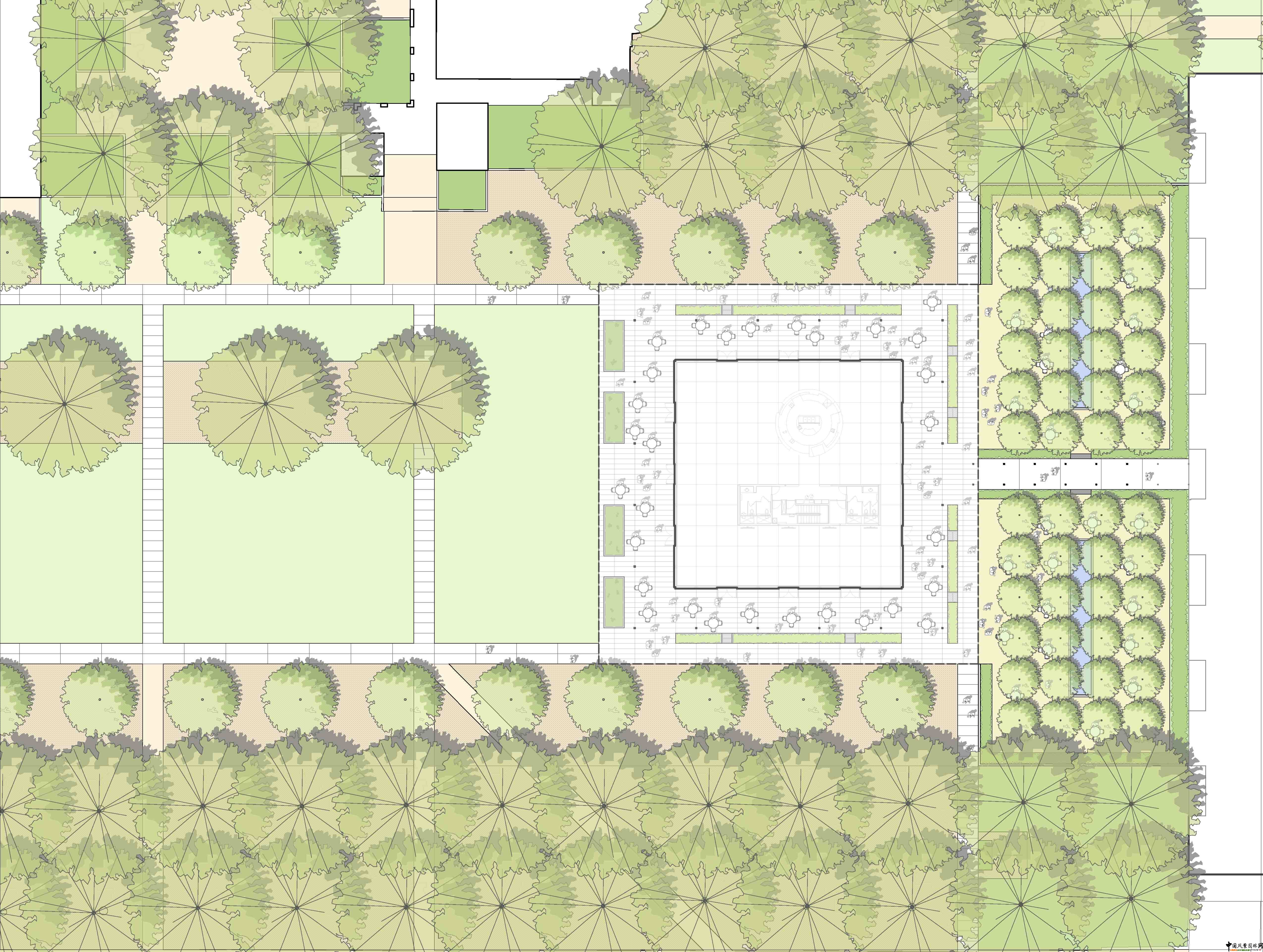 由于中央四方形領(lǐng)域的限制,西面只限于加強(qiáng)了現(xiàn)有的空間架構(gòu),但新創(chuàng)建的Brochstein亭和圖書館間需要有一個復(fù)雜的方案,為了與Brochstein亭的格子結(jié)構(gòu)相呼應(yīng),在風(fēng)化花崗巖土質(zhì)上種植48種榆樹灌組成了一種組織架構(gòu),使得整個空間范圍變的人性化。連接著Brochstein亭與圖書館的一條混凝土步行街將小樹林一分為二,分成了兩個周圍種滿非洲鳶尾花的小花圃。布滿沙灘石的長方體黑色噴泉占據(jù)了每個空間的中心。潺潺流水反射著透過華蓋的斑駁陽光。移動的座椅以及斑斑點點陽光使臨時聚集的觀賞者們能夠享受由濃密的光影和日夜不息的流水形成的綠洲。