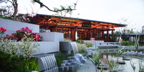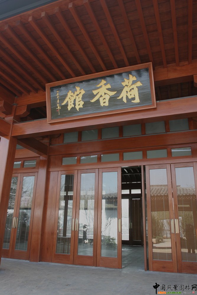 荷香館和聽雨軒作為中國園中的主體題建筑,位于凝翠園,一大一小、一高一低、一主一輔。兩者均以“鋼骨肌”構(gòu)造方式表達漢唐風尚的當代建筑,傳統(tǒng)與現(xiàn)代相融合,與上海世博會所體現(xiàn)的當代中華大國風尚相呼應。荷香館占地一畝,以碧水荷花為主景,周邊配以現(xiàn)代的方形疊石,臨水建有親水平臺,可在此品茗休憩,宛如西湖十六景中的“曲院風荷”意境。建筑設計還注重了生態(tài)效應,優(yōu)先考慮被動式的保溫隔熱做法,輔以主動式手段在需要時對室內(nèi)氣候進行調(diào)節(jié)。荷香館左右兩廂均為純木結(jié)構(gòu)廊道,其南為一座純木結(jié)構(gòu)亭臺-四方亭,含喜迎四方賓客之意。純木結(jié)構(gòu)的廊和亭的建造方式與“鋼骨木肌”的館與軒有所不同。借用我國南齊謝赫在《古畫品錄》中提出的中國繪畫之六法,通過“傳移模寫”和“骨法用筆”來達到“氣韻生動”的境界。