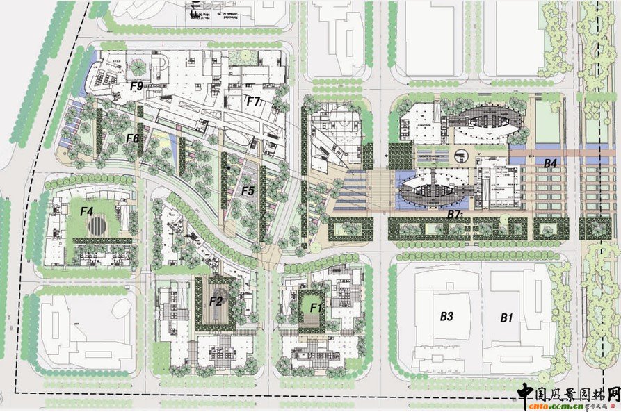 核心區的景觀設計是與總體規劃本身同時進行的,并緊密地聯系著周邊的住宅、辦公、及公園地區的設計。建筑的外觀設計將采用開放手法,結合街旁樹木,街燈,和石面路的設計提高工程的總體質量。工程強調室外公共場所的設計和與附近較大型公園的關系。一系列的交通循環條件和花園的幾何形狀加強了這種關系,并把建筑、場地規劃的內部和外觀,開放和隱蔽的性質緊密地連接在一起。當花園波浪型的地面與各種建筑的波紋板被發展為一個統一的景觀時,交織效果也將同時由三維效果與表面循環而形成。此設計將創造一個“園內有樓,樓內有園”的獨特的理想格局。植物,水流以及硬質地面都在此關系中起著極為重要的作用。樹木將用來構造公園內的空間與運轉;而灌木叢將創造室外花園房間以及開放草坪可利用空間。水,它巧妙地從花園流入建筑,鞏固了花園與房間的關系,并將花園的質地與明亮的特性引入了建筑。