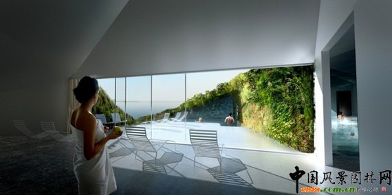 浮島內(nèi)部是洗浴和理療房,外部是水和園林。該項(xiàng)目把墻、天花板等等建筑外圍變成了山、谷這些看上去很自然的園林要素。游覽者在這里可以看到水、植物和建筑相結(jié)合的景觀。