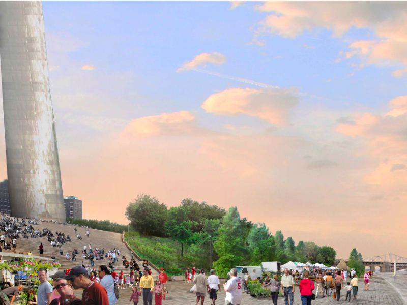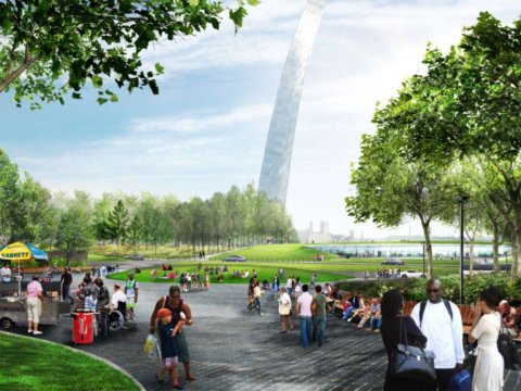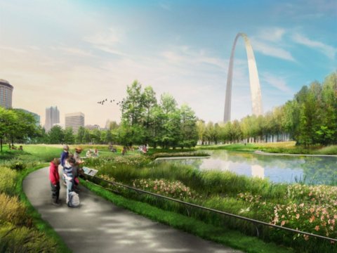 中國風景園林網 大拱門(Gateway Arch)是一座位于密蘇里州St. Louis的地標性建筑。為了讓這座美國最大的國家紀念碑與城市中心區,密西西比河,以及伊利諾斯銀行有更好的聯系,從而使其變得更有活力,而舉辦的“城市+拱門+河流”項目設計招標中,由Michael Van Valkenburgh所領導的MVVA團隊憑借其可持續性的園林景觀設計,于上周五(24日)從其他四家知名設計公司中脫穎而出。