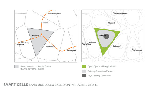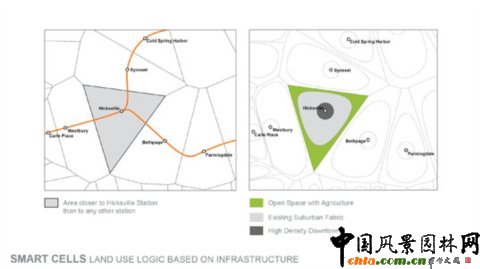 根據土地使用的條理性和現有基礎設施情況,長島的根本改造中的智能細胞將重點對區域的細分坐出調整。城市中心區域將更加緊密而有序,使得人為景觀得到更加高效的利用,城市周邊區域則保留出開放空間,為農業和棲息地的恢復保留提供場所。