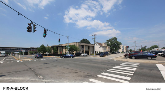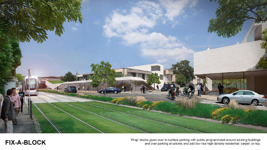 FIX A BLOCK:街區上現存露天停車場,對于公共空間沒有定義是如今的現狀。為了彌補,建議以下通過改造方式:室內停車場,街區服務的完善,明確用地性質,形成低層高密度的結構。