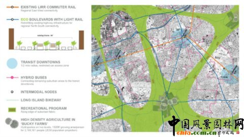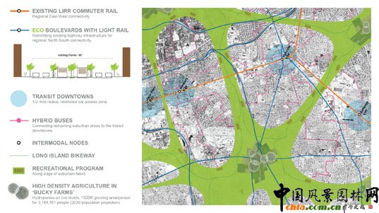 中國風景園林網 美國曼哈頓市也許是個可以良好快速運轉的機器,但是這片繁華喧囂大城市周邊的郊區卻是另一幅景象:空曠的場地、光禿禿的瀝青公園以及粗略的城市規劃,這些都對人們生活的社區社會經濟造成持續性破壞。長島勞奇基金會贊助了一項設計規劃競賽,主題為“建設一個更美好的郊區( Build a Better Burb)”,競賽中所涉及的約33.6平方公里(8300英畝,大概相當于第五十大街所在的曼哈頓南部的面積),地塊位于紐約東部的長島。