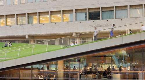海帕館坪只可從廣場進入,草坪面積為7200平方英尺,在兩個相對的角落隆起,而餐廳就夾在廣場和草坪層之間。草坪位于建筑之上,能遠離城市噪音和交通,形成一個城市田園之處。
