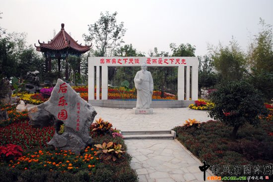 其中濱州園景園是一道簡潔而有寓意的景觀。這尊當門而立的“后樂園”景石,向游人表明了濱州景園的主題。廣場上矗立的范仲淹塑像,底座上鐫刻的范仲淹在鄒平的生活經歷,廣場后面的“水簾”背景墻,和這“先天下之憂而憂,后天下之樂而樂”的千古名句,一起告訴人們,范仲淹的清正與高潔。建在高坡上的仿古六角亭,是范公亭。鵝卵石鋪就的小路,引導人們參觀各個景點后,可以登上范公亭,緬懷先賢,領悟人生。濱州園的景觀植物,選用了荊樹樁、檉柳樁、棗樹、柏樹樁、石榴樁等,它們在范公亭前映襯的是,青春不老,老而彌堅。這些大葉女貞、國槐、楸樹、連翹,以及花灌木,竹林,草坪鮮花等,卻是為了體現生命的多姿多彩。因此,濱州景園就會讓人在欣賞的同時,產生許多神游古今的聯想和感慨。