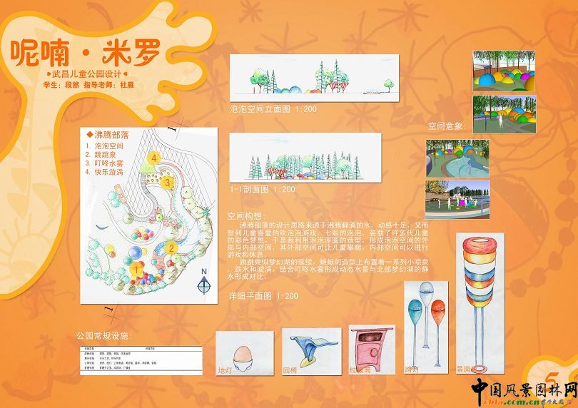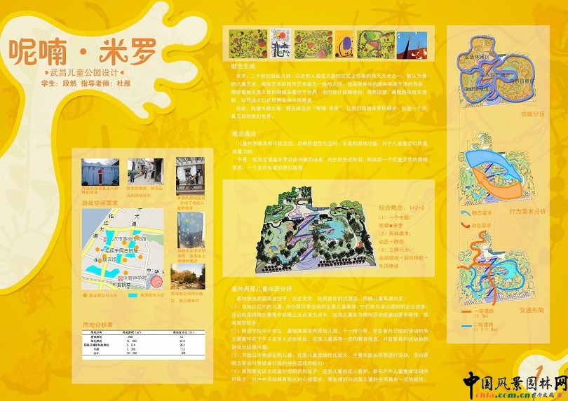 呢喃 米羅 概念生成: 米羅,二十世紀(jì)繪畫大師,以史前人類或兒童的方式去作畫的偉大天才之一。被認(rèn)為是把兒童藝術(shù)、原始藝術(shù)和民間藝術(shù)融為一體的大事,他采用單純的線和明亮干凈的色彩,用孩童般天真無邪的眼睛來看這個(gè)世界,他的設(shè)計(jì)簡略單純、奇思遐想、幽默趣味而又清新,如同孩子們的世界是單純而唯美。 由此,我借大師之筆,將主體定為“呢喃 米羅”,讓我們跟隨米羅的腳步,創(chuàng)造一個(gè)天真無邪的奇幻世界。 概念表達(dá): 兒童的思維具有不穩(wěn)定性,動(dòng)感的造型與空間,豐富的游戲功能,對于兒童是變幻而富有魔力的。 于是,我決定借鑒米羅自由伸展的線條,純色的各式形狀,構(gòu)筑成一個(gè)反復(fù)無常的滑稽世界,一個(gè)多姿多彩的夢幻國度。 ![]() ![]() ![]() ![]() ![]() ![]()