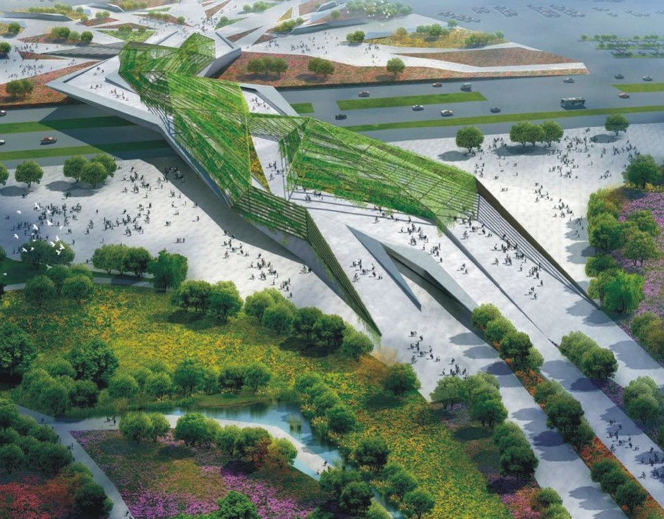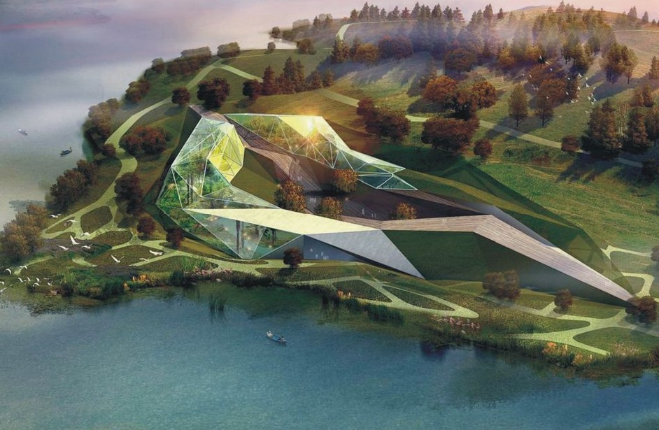 自然館位于2011西安世園會主軸線上,整個展館結合碼頭和周邊場地進行設計,建筑布局呈“王”字型,由三翼不規則幾何體組成,青銅金屬、石材及花園式種植屋面等不同飾面的無規則銜接處理,形成了錯落有致、內涵豐富的藝術效果。將展覽展示園林園藝、植物花卉的新成果、新產品以及環保節能新技術、新材料等。
