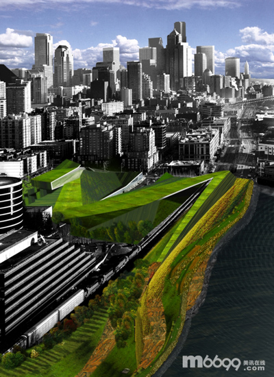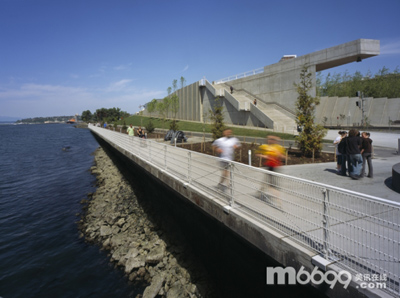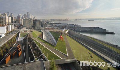 奧林匹克雕塑公園設計曾贏得過國際設計比賽,這是一個連續(xù)的景觀設計,從城市向海邊蜿蜒過去,公園內設計了新的人行交通道路。利用機械加固土地系統(tǒng),這個增強型的地表重建在原來的場地地形上,跨過公路和鐵軌。主要的人行通道從18000平方英尺的展館開始,呈輻射狀通向場地的其他地方。第一條跨過公路,通往奧林匹克山;第二條跨過鐵軌,通往城市和港口;最后一條通往新治理后的海灘。