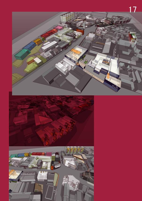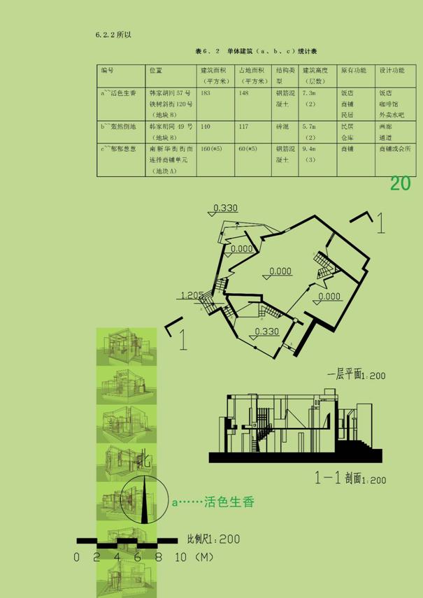6成果及相關分析 6.1地塊D規劃設計 6.1.1 因為 。ǎ保┓治 五道廟這半錐之地經過多少次改朝換代,氣質故我。地塊D(如圖5.1)是四個地塊中混合功能最多,性質最復雜的一塊。 此處街區性質與北京傳統純居住性質的胡同有本質上的不同--雖然結構是屬于同一系統的。這里更為復合,更趨近生活。古老的街道的表象下是國際化的雜糅包容的本質。 基于以上對地塊性格的理解,希望在保持原有街區節奏的前提下,面對五道廟這個極復雜的系統,與地塊高度個性化的對話,由現場的特質所激發的直覺出發,碰撞出的應該是一種凝固的相臨界狀態--關于生活,及其他。 畢竟,我們所接受的傳統感染很不足夠--對北京胡同的感受更沒有深入骨髓(小組四個成員中沒有一個北京本地人);從小接觸的各方面元素也很不純粹,很難在短時間內做到與原有系統完全一致。而且,現階段,導致方案的最終形態主導還是個人的創作沖動,本能的進行設計,理論性指導……僅僅是指導。 6.1.2所以 ![]() ![]() ![]() ![]() ![]() ![]() 6.2 單體建筑(a、b、c)設計 6.2.1因為 。ǎ保゛~~活色生香 位于五道廟廣場東北角,韓家胡同與鐵樹斜街交匯處。沿街角呈現很不規則的形狀。此處兩個建筑現擠下一家小飯館,一家食雜店,一家早點鋪,里面還有居住的空間! 這個地方可看作五道廟區性格的濃縮--擁擠、包容、無序、極富戲劇化。故于此處擬建一個極盡復雜之能事的小建筑,將這里內容之豐富延續到空間之豐富。功能為一個小飯館,一家小咖啡館(星巴克式的快餐是的擁擠的,非可消磨一天的那種空曠幽靜的咖啡館)或冰淇淋店,一個小的外賣水吧窗口。 。ǎ玻゜~~轟然倒地 位于韓家胡同,位置較內向,周邊多民居,商鋪漸少。 民革時期的建筑,墻上一個那個已經生銹的紅色五角星極富時代特征,在街面上十分顯眼,仿佛還在訴說著那個年代的沖動與狂熱。那個樣子的中國在我是不可想象的。 這樣一個建筑觸動了我的表現主義神經。 通過與該地塊規劃者的溝通,決定在此做一個畫廊。同時在一層留一條通道至鐵樹斜街現存的半條小巷。 (3)c~~郁郁蔥蔥 南新華街上極平常的一排小單元商鋪。這里現狀本可以不動。我希望做一個實驗性的小商鋪單元,模擬五道口城鐵站附近的連排商鋪那種質感,空間單元小,劃分曖昧不明。 ![]() 圖6.3 單體建筑位置示意圖