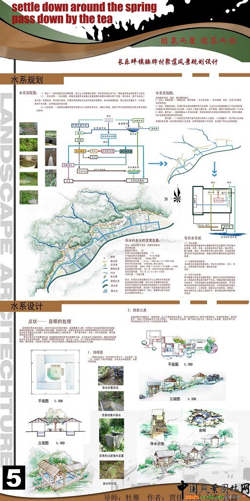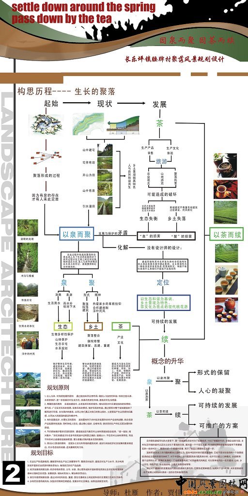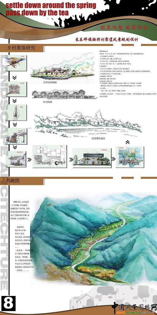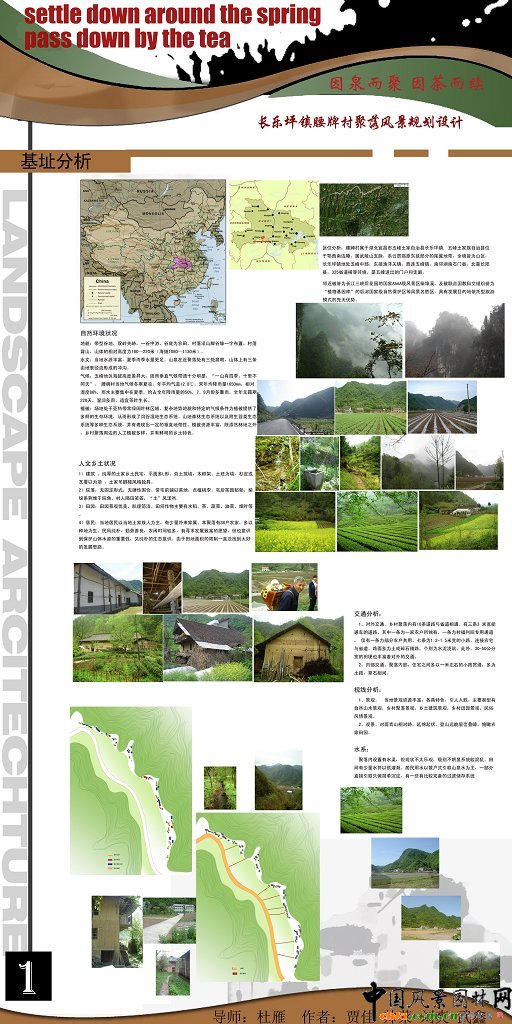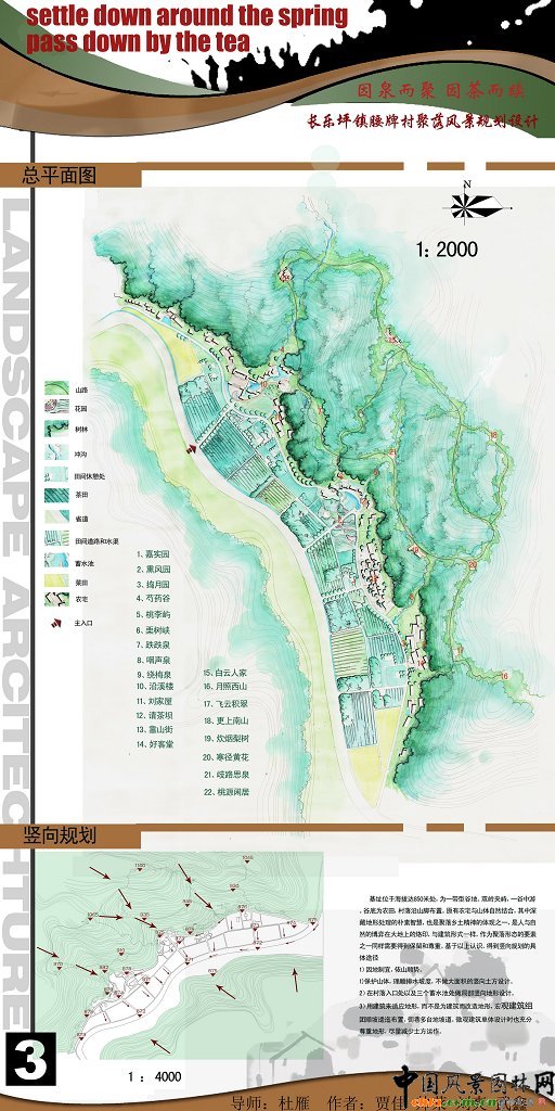 中國風景園林網訊 本設計是中國風景園林網的畢業生系列作品展作品之一,來自華中農業大學園林系08屆畢業生。 長樂鎮腰牌村聚落風景設計 規劃原則: 1.以人為本、可持續發展的原則:通過規劃科學合理布局,做到人與自然的和諧,特別注意水源、水系的保護,進一步改善農村生活方式、改善農民居住環境,提高農村生活質量。 2.尊重民意的原則:在規劃建設中,必須發揮農民積極性,增加農民對村莊建設規劃的知情權、參與權。廣泛征求農民的醫院,反映農民的要求,保護農民的利益。通過使其對整個規劃建設的了解而進行環境、文化保護的教育,從而讓他們真正對自己的青山綠水、土屋菜田產生認同感和歸屬感,從而加入到家園的建設和維護中。 ![]() ![]() ![]() ![]() ![]()