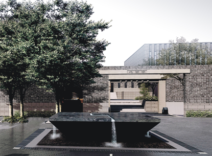別墅區的景墻,一為墻上的裝飾,增強建筑的氣場;二是作為私家大院的遮擋,使氣流繞壁而行、聚氣不散;三又表明了院落的內外有別,營造一種和諧、安謐、幽靜的環境。宅門入口兩側,各配一塊形似圓鼓的石制構件,實為東方“非貴即富”的門第符號――抱鼓石,以彰顯屋主身份地位的等級差別。 豎鋪勾勒,一色天青的煙雨之地