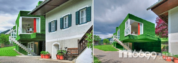這座超現(xiàn)實(shí)主義住宅是奧地利建筑事務(wù)所WeichlbauerundOrtis的作品,已經(jīng)成為了Fronlaytena附近的鄉(xiāng)村旅游勝地。 草皮覆蓋的混凝土小屋復(fù)雜的設(shè)計(jì)概念旨在從各個(gè)角度打造幾何與光學(xué)錯(cuò)覺(jué)。 這個(gè)元素游戲帶來(lái)的僅僅是審美功能,既要在周圍傳統(tǒng)建筑里凸顯這座不同尋常的建筑,又要完美地融合到當(dāng)?shù)氐淖匀伙L(fēng)景中。 建筑堅(jiān)硬的混凝土直線造型通過(guò)Astroturf的人工草坪得以弱化。項(xiàng)目概念來(lái)源于著名的荷蘭圖形藝術(shù)家MauritsCornelisEscher的錯(cuò)覺(jué)繪畫。