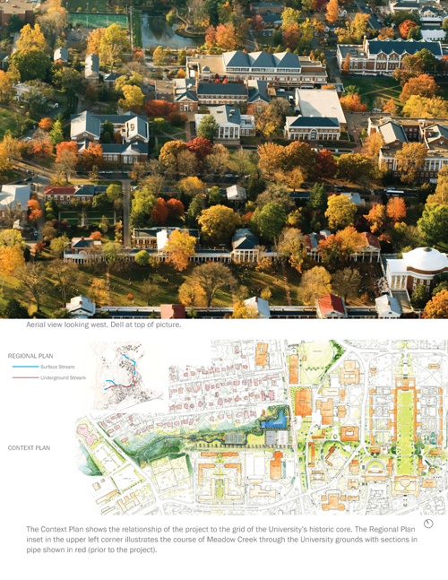 該幽谷是一個11英畝的混合景觀,復興了佛吉尼亞大學一處掩埋的溪流,將一處被遺棄的未使用過的土地翻修成為一個藝術級的雨水池和(從中引水驅動水輪或葉輪的)前池系統(tǒng)。公園將消失的野生動植物棲息地再次引入,同時提供了多種娛樂休憩機會,調整了學院和周邊景觀之間的相互關系;是大學入口處一個令游客難忘的景點,同時也是一處職能性的示范景觀,是為學生和教職員而設的佛吉尼亞當?shù)厣鷳B(tài)植物花園。