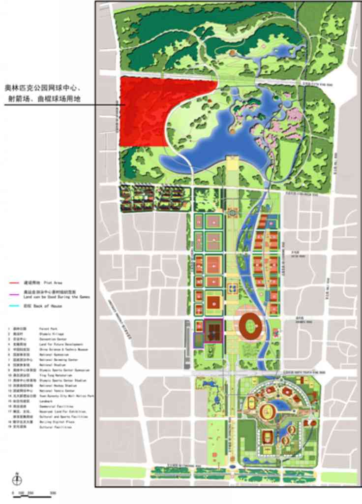 景觀設計原則 從城市現狀及用地周邊情況分析,網球中心的景觀設計重在銜接——完成從西側規整的城市網格向東側自然生態環境的自然過渡,以協調整個城市景觀尺度,順應其張弛有序、疏密有致、節奏舒緩、相對流暢的總體效果。奧林匹克森林公園在此以景觀綠色載體形式存在,其自然生態的生命內涵也是本設計的主旨。 網球中心總體規劃設計的理念為“森林公園中的花朵”,為突出建筑的原生態,建筑主體的材質選用了清水混凝土,更加增添了其雕塑感。在總體景觀設計中,我們延續了原始的規劃設計理念,盡量減少繁縟復雜的,小尺度的景觀小品、花園等小型景觀節點處理方式對主建筑群的干擾。采用了大尺度的景觀處理手法,突出強調綠色主題(樹木、草地等)對建筑主體的圍和。營造綠色景觀與清水混凝土材質的融合的氛圍,強調景觀設計主題“森林中的網球中心”。以一種謙和內斂的設計突出網球中心不動聲色的大氣、不著痕跡的個性、不落窠臼的沉靜。 總體景觀設計以觀眾的主線——中心步道為主軸線,以西側的巨型樹陣呼應城市的布局并作為景觀樂章的序曲,營造出一個城市廣場應有的恢宏氣勢:以逐漸升起的賽場平臺提升建筑的氣勢,改變人們的景觀視角并在1#平臺達到整個樂章的高潮,突出主體建筑對群體的控制性;以西側的大面積自然集中綠地、人工地形作為景觀主軸的自然對景并逐漸融入到奧林匹克森林公園的自然形態之中,以舒緩的節奏完成了整個樂章,實現了從城市到自然生態的過渡。 通過對樹種的精心選擇與搭配營造出四季不同的景觀效果,以不同形態的樹種劃分主要環路、次要道路、人流通道、停車產等不同的功能;以不同高低的樹種選擇保證各部分功能的實現;以不同特點的樹種實現物種的多樣化搭配;以四季應時鮮花裝點主要的近人景觀綠地;以不同的排列方式完成從規整到自然的過渡;以選用北京市本地樹種保證樹木的生長狀態并控制維護成本。 設計背景及場地功能分析: ![]() 一、奧林匹克公園概況 奧林匹克公園總用地約 二、森林公園與奧林匹克公園的關系 森林公園位于奧林匹克公園北部,與奧林匹克公園中心區隔辛店村路相望,是奧林匹克公園內與城市相交的主要界面。作為北京城市中軸線向北的延伸,奧林匹克公園的景觀設計沿用了北京城的規劃與景觀設計原則,城市棋盤式網格通過貫穿公園南北軸的有序景觀被延伸至公園內。這套網格起自湖畔,止于森林公園廣場。北京的城市中軸線通過森林公園融入自然環境,森林公園又通過龍形水系融入城市,在奧林匹克森林公園城市與自然得以共融。 總平面圖: ![]()