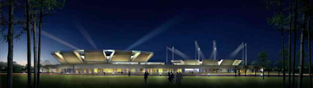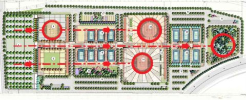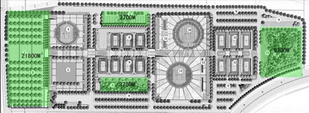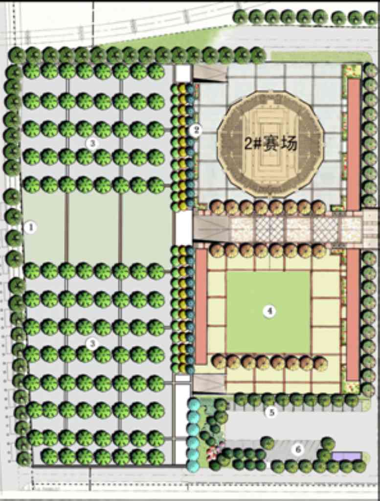 1.前廣場2.樹陣林蔭廣場3.后勤用房4.2#比賽場5.休息疏散草坪6.預賽場地7.后勤用地8.集中綠化9.停車場10.1#比賽場11.采光天井12.練習場13.景觀綠化中心14.中心賽場15.雕塑 視線分析圖: ![]() 夜景鳥瞰圖: ![]() 中心賽場效果圖: ![]() ![]() 綠地面積 ![]() 分區一: 分區一以矩形樹陣的序列綠化形成景觀的序曲,構成入口處的主要景觀,以綠茵廣場的形式存在。廣場的平面肌理順著白廟村路一直向南延續到曲棍球場西側的小廣場,其間以簡練的設計元素詮釋統一的設計風格——鋪地的微妙變化、色彩的不同表現、材質的不同選擇等。 3#平臺上以水景為特色,在通道的兩側靠近樹池的地方以及中心與觀賽入口相對應的重要節點上設置旱噴的噴水點,既能在必要時起到烘托比賽場館和賽事喜慶氣氛的作用,又能在人流較多的時候保證疏散所必需的交通寬度。 ![]() 分區一平面圖 1.安全檢查入口2.小型種植池3.林蔭廣場4.休息及疏散草坪5.停車場6.巴士停車位
