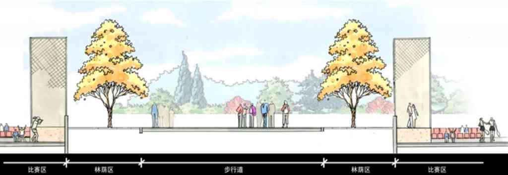 分區一剖面圖 ![]() 分區二: 分區二以較為豐富的種植層次為特色,在中心通道周圍形成小型觀賞喬木到體形瘦長的常綠喬木,再到比賽場地這樣一個有秩序的空間層次,中央通道是最主要的視覺軸線,設計以序列的鋪裝,常綠的植物加強了軸線感覺,增加了景深,讓人在不知不覺中完成心理上由入口廣場到2#平臺的過渡。常綠喬木的形勢特點,對比賽場地起到了一定的遮擋作用,很好的避免了人流的停止而造成的交通混亂。觀賞型小喬木以及常綠喬木的搭配也在最大限度上增加了景觀軸上不同季節的可觀賞性。 ![]() 分區二平面圖 1.坡道2.比賽場地3.后勤用地4.停車場5.時令花卉6.觀賽通道7.集中綠化8.架空連橋 ![]()