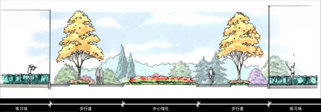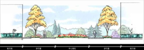 分區二剖面圖 分區三: 分區三由于主要提供球員的練習場地,因此需要的疏散寬度相應較小,因此在軸線上種植池種植觀賞性灌木,以及可隨時更換的時令花卉,兩側種植形態優美的北京市樹銀杏,在種植上體現北京奧運的特色。 ![]() 1.集中綠化景觀2.練習場地3.巴士停車位4.停車場5.分割綠籬6.種植7.交通綠島