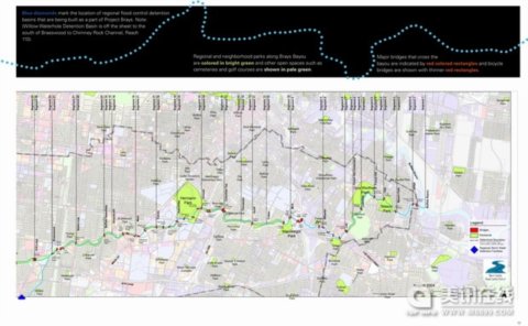 ![]() 布雷河環境關系圖。布雷河(藍色部分)從上流源頭的貝克水庫流到水牛灣和休斯頓運河。布雷河總長35英里,流經西園收費路,阿瑟斯托瑞公園,610環道,德克薩斯醫療中心,赫爾曼公園,休斯頓大學。鄰近水域的雨水都匯流于布雷河。