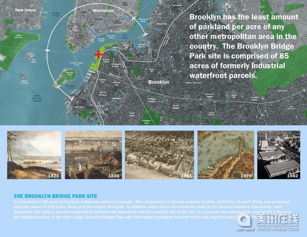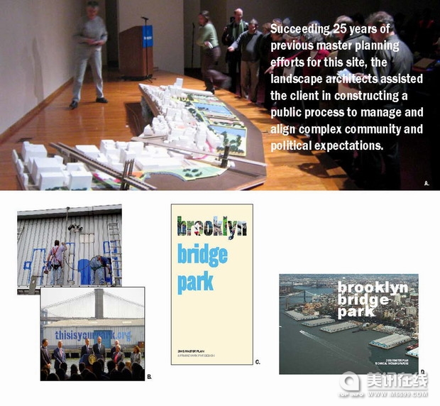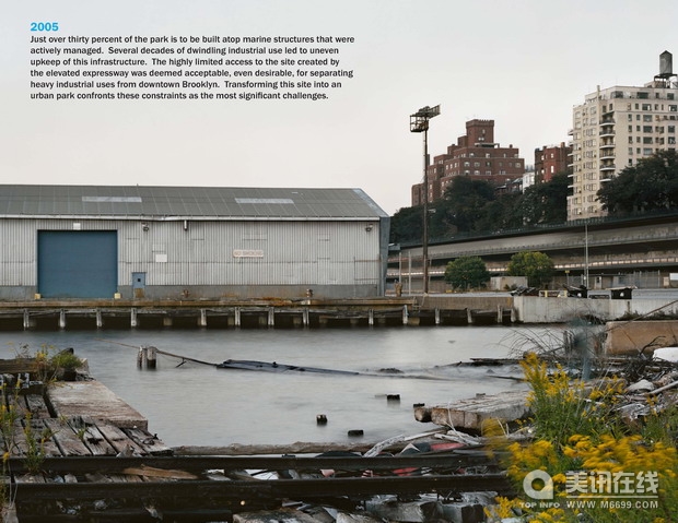 榮譽獎:布魯克林大橋公園 客戶:布魯克林大橋公園開發公司 “有創意、非常清晰、簡潔。這個項目在公眾領域、自然資源和環境規劃方面有著非常重大的意義。它使用了大量的工具來解決城市問題,并且把生態元素和社會元素很好地融合在一起。” ——2009年ASLA專業獎評審團 項目簡介 2005年布魯克林大橋公園的總體規劃就提出了一個很好的框架,它改建了這個景色優美但環境污染嚴重的廢棄貨船場地,使這個地方在社會多樣性、靈活性和心理范疇方面有了很優秀的表現。這個項目規劃很流暢的把多種項目目標結合在一起,其中包括:綜合性、環境可持續性、經濟效益、城市連通性和社會活躍性。 ![]() 布魯克林大橋公園的場地由原來的85英畝工業用地組成。200年前,這個工業用地就開始建造,此后的電線桿、碼頭平臺和道路的建造,以及土地填充,使得這里的自然河岸線已經杳無蹤跡了。另外,城市大型基礎設施的建設使得這塊河岸地區和城市日常生活之間的聯系被隔斷了,比如,上個世紀建造的“布魯克林區—皇后區高速公路”。布魯克林大橋公園的建造會部分地消除這個地區所受到的工業化影響,恢復這里的生態系統,然后把這條河和城市重新連在一起。 ![]() 公園百分之三十的部分計劃建造在這些被處理過的水工建筑上。從幾十年前開始,這里的工業用途逐漸變小,因此有些建筑沒有得到比較好的維護。此后,高架快速公路的建造使得這個地方更加難以進入,但是這卻是當時大眾所希望的,因為這條高速公能把這個重工業用地從布魯克林商業區中隔離出來。而現在這卻成為了城市公園建設所遇到的最大挑戰。 ![]()