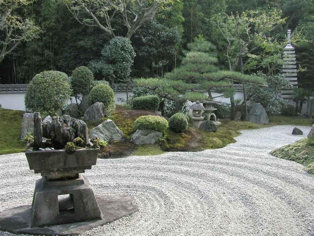 公元538年的時候,日本開始接受佛教,并派一些學生和工匠到古代中國,學習內陸藝術文化。13世紀時,源自中國的另一支佛教宗派"禪宗"在日本流行,為反映禪宗修行者所追求的"苦行"及"自律"精神,日本園林開始擯棄以往的池泉庭園,而是使用一些如常綠樹、苔蘚、沙、礫石等靜止、不變的元素,營造枯山水庭園,園內幾乎不使用任何開花植物,以期達到自我修行的目的。