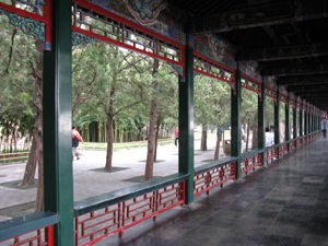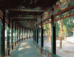 在頤和園循萬壽山南麓沿昆明湖北岸構筑。始建于清代乾隆十五年(1750),1860年被英法聯軍焚毀后,于1888年又重新建造。長廊東起邀月門,西至石丈亭,中間穿過排云門,兩側對稱點綴著留佳、寄瀾、秋水、清遙四座重檐八角攢尖亭。象征春夏秋冬四季。全長728米,共273間。長廊以其精美的建筑、曲折多變和極豐富的彩畫而負盛名,是我國古建筑和園林中最長的廊。長廊還是一條五光十色的畫廊,廊間的每根枋梁上都繪有彩畫,共14000余幅,色彩鮮明,富麗堂皇,它的長度和豐富的彩畫在1990年就被收入了《吉尼斯世界紀錄大全》。