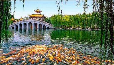 全園水景,堪稱一絕。荔景灣、清平湖、寶墨湖與1000多米長河貫通,水清如鏡,長流不息,30多座石橋,橫跨旖旎河湖之上。若駕畫舫輕舟,逍遙放棹,仿似置身蓬瀛。清平湖上的紫洞舫有如一座水上藝術宮殿。湖面上,虹飛紫帶;湖周圍,綠柳侵煙;喜看錦鯉千千紅浪涌,游人個個笑顏開。紫園里的紫竹溪,專供小孩玩水觀魚,更是兒童的歡樂天地。
