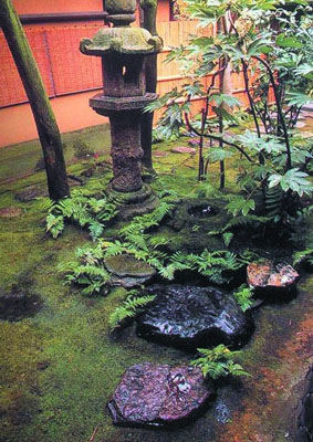 茶庭也叫露地是源自茶道文化的一種園林形式,至今茶庭的景觀作用己大于實(shí)用功能。茶庭式園林一般是在進(jìn)入茶室的一段空間里,按一定路線布置景觀,以拙樸的步石象征崎嶇的山間石徑,以地上的矮寓指茂盛的森林,以蹲踞式的洗手缽聯(lián)想到清冽的山泉,以滄桑厚重的石燈籠來營造和、寂、清、幽的茶道氛圍。有很強(qiáng)的禪宗意境。