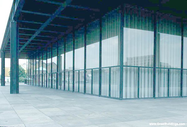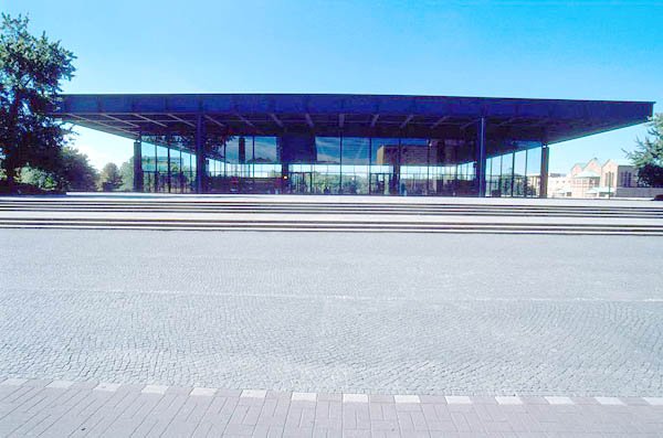 密斯的名聲,從1929年設(shè)計(jì)巴塞羅納國(guó)際博覽會(huì)德國(guó)館開(kāi)始,走過(guò)40年的人生,為他的祖國(guó)設(shè)計(jì)的新國(guó)家美術(shù)館,標(biāo)志著人生最后乃至最高的到達(dá)。和巴塞羅納的德國(guó)館相比,晚年的設(shè)計(jì)已經(jīng)是在單純的造型中尋找到歸宿,他為新國(guó)家美術(shù)館設(shè)計(jì)的是一個(gè)幾乎不需要進(jìn)行任何切割的巨大正方形。