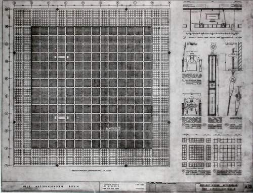 密斯同樣崇尚絕對(duì)主義繪畫的崇高性,并試圖建造了一座絕對(duì)主義的殿堂,這座新國(guó)家美術(shù)館,與馬列維奇那件“黑色的正方形”作品在精神上有著認(rèn)同關(guān)系。只不過(guò)密斯是把灰色的正方形地面當(dāng)作畫布,如果我們的視角是從空中垂直看這座建筑,就是一個(gè)黑色的正方形,最好的說(shuō)明是這座建筑的施工圖紙上再清楚不過(guò)地展示了正方形和邊緣的關(guān)系。然而真正的震撼不是來(lái)自從俯視的角度,而是當(dāng)你走進(jìn)這個(gè)美術(shù)館,只有八根柱子懸挑起來(lái)的巨大黑色正方形屋頂,蓋在所有人的頭頂上,形成巨大的壓迫感。