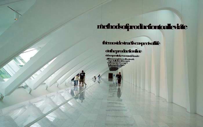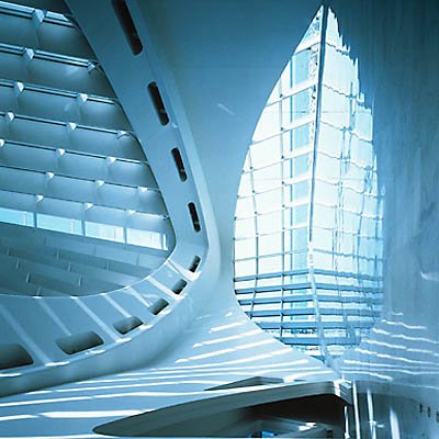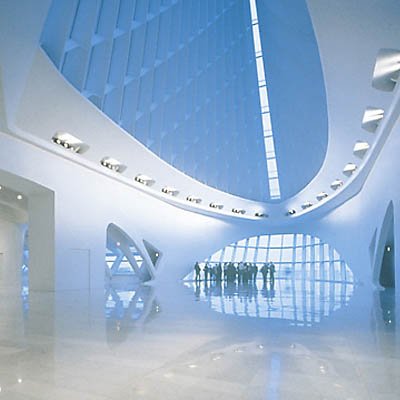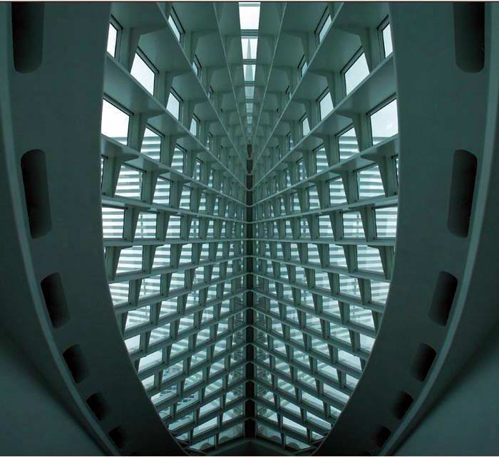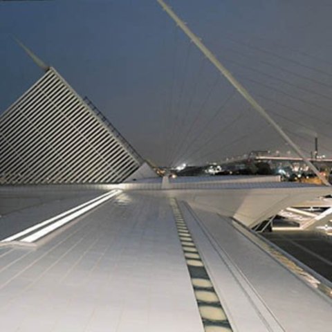 這個(gè)建筑無(wú)論放在什么地方,都一定是個(gè)絕色,別的建筑沒(méi)法兒和它比肩而立的。2001年由美國(guó)《時(shí)代》雜志評(píng)選的年度設(shè)計(jì)榜上,米爾沃基美術(shù)館被舉為頭名。此一排行榜不僅收羅了當(dāng)年的新建筑,還包括家具、汽車(chē)、時(shí)裝設(shè)計(jì)乃至于電影的美工設(shè)計(jì),可見(jiàn)行外的人們被它感動(dòng)的程度。難得卡拉特拉瓦把爛熟的老式建筑材料鋼筋混凝土耍弄到了得心應(yīng)手的程度,居然借此再把爛熟的結(jié)構(gòu)審美推近了你的鼻子尖兒。有很久了,建筑師和結(jié)構(gòu)工程師之間涇渭分明各司其職,而且,說(shuō)心里話(huà),有很多建筑師只把結(jié)構(gòu)設(shè)計(jì)看成是不得不容忍的束縛和累贅,是我們戴著跳舞的枷。專(zhuān)業(yè)細(xì)分的行規(guī)多年來(lái)讓我們以為,我們只要靈光不斷如噼哧噗哧的打火機(jī)般就是本分了,讓房子立起來(lái)不倒,俗務(wù)罷了,留給結(jié)構(gòu)工程師去算也罷。卻是忘記了,文藝復(fù)興的建筑巨匠們,會(huì)以結(jié)構(gòu)想象力作為新創(chuàng)造的出發(fā)點(diǎn)。周遭所有相關(guān)的藝術(shù)和科學(xué)門(mén)類(lèi)都為我所用,這樣的盛況本已難再,竟又意外地出現(xiàn)在新的世紀(jì)轉(zhuǎn)換點(diǎn)上,可不是讓人喜出望外?