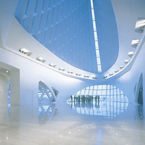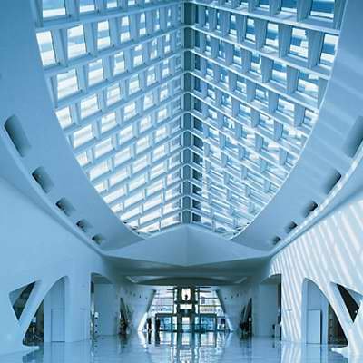 從80年代以來(lái),無(wú)論是后現(xiàn)代主義,還是解構(gòu)主義,都搖動(dòng)旗號(hào),以丑以怪以非理性掀起了審美價(jià)值觀上的革命。如若有誰(shuí)還在大言不慚地喊叫著建筑的美,則其落伍老土為無(wú)疑了。新奇而丑怪,看久了以后就不再新奇,而更加丑怪,有的時(shí)候難免會(huì)折磨得看的人心情沮喪起來(lái)。忽見(jiàn)卡拉特拉瓦這清新大膽的建筑,看到美的回歸,情不自禁為之大快。以技術(shù)能力探究人類(lèi)制造美的潛力,以自然法則創(chuàng)造超邁的人工造物而又與自然交相輝映,這股豪氣,和文藝復(fù)興時(shí)期的氣度一脈相承。