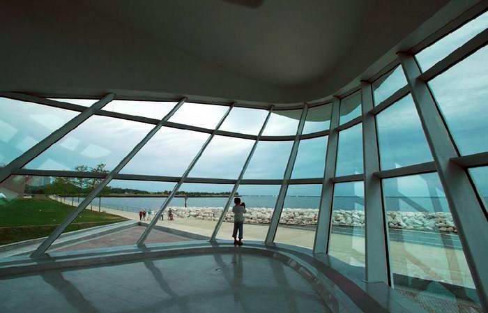 卡拉特拉瓦的密爾沃基美術(shù)館位于密執(zhí)安湖畔,粼粼波光似乎是全球各地很多博物館建筑不約而同偏愛(ài)的環(huán)境條件。在美術(shù)館旁邊還有另外一個(gè)好的老的建筑,是沙里寧1957年設(shè)計(jì)的戰(zhàn)爭(zhēng)紀(jì)念館。為了盡情發(fā)掘地段環(huán)境與生俱來(lái)的優(yōu)美潛力,卡拉特拉瓦把建筑放成了在水一方。