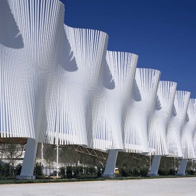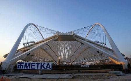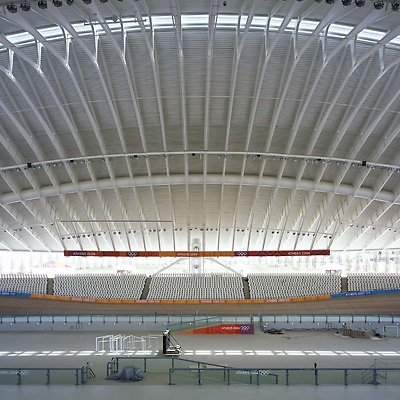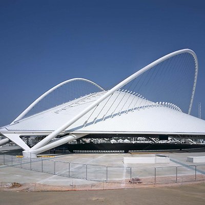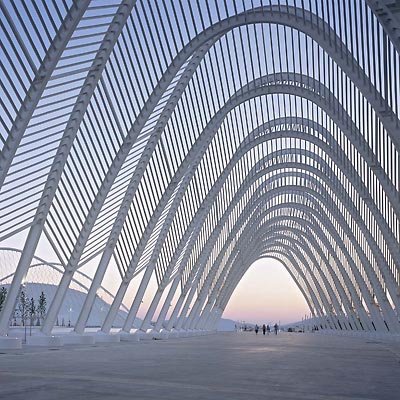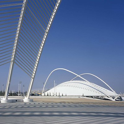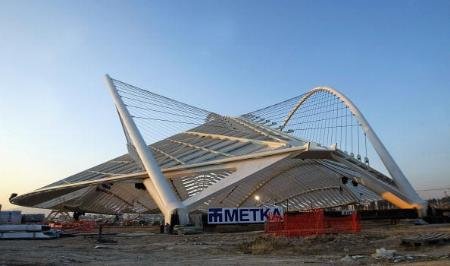 雅典奧林匹克綜合體育場(chǎng) 雅典奧運(yùn)主場(chǎng)館由已有二十年歷史的舊場(chǎng)館加建而成。由于奧運(yùn)會(huì)在酷熱的盛夏舉行,為了使大部份觀眾能舒適地欣賞比賽,把有蓋座位盡量增加成為改建的主要目標(biāo)。這項(xiàng)目由著名西班牙建筑師卡拉特拉瓦設(shè)計(jì),主要是在原場(chǎng)館上加上兩條長(zhǎng)304公尺,高80公尺的大型拱梁,再用鋼纜拉起總面積超過(guò)一萬(wàn)平方公尺,總重量一萬(wàn)六千噸的纖維版屋頂。這能容納超過(guò)七萬(wàn)人的場(chǎng)館改建之後,有蓋座位由35%增加至95%。和上屆悉尼奧運(yùn)當(dāng)時(shí)全新興建以空間構(gòu)架(Space Frame)為主結(jié)構(gòu)的場(chǎng)館比較,雅典場(chǎng)館雖然座位較少,但這拱梁和屋頂結(jié)構(gòu)的形態(tài),卻顯然有著歐洲式的優(yōu)雅。 奧林匹克體育館建筑群離市中心約5km,這里除了舉行奧運(yùn)會(huì)開(kāi)幕式、閉幕式外還將舉行自行車(chē)、游泳等項(xiàng)目的比賽。卡拉特拉瓦稱此工程為“奧林匹克夢(mèng)想”,它將使有20年之久的老體育館發(fā)生翻天覆地的變化。兩只鋼穹頂將橫跨球場(chǎng)上方,半透明玻璃懸于座位區(qū)之上,可以讓陽(yáng)光進(jìn)入又可以阻隔熱氣。卡拉特拉瓦希望這個(gè)有鋼、混凝土、看得見(jiàn)風(fēng)景且?guī)е诺渲獾慕ㄖ芙o人留下難忘的映象,并能激發(fā)出奧林匹克精神。卡拉特拉瓦說(shuō)這個(gè)設(shè)計(jì)的靈感來(lái)自拜占庭建筑,穹頂、藍(lán)白基調(diào)源于愛(ài)琴海及其諸島。